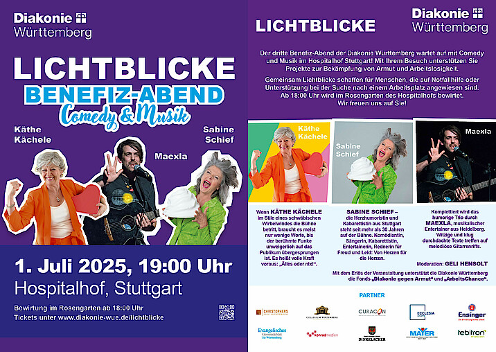 Die Diakonie Württemberg lädt am Dienstag, 1. Juli 2025, um 19 Uhr zum dritten Benefiz-Abend „Lichtblicke“ in den Hospitalhof Stuttgart ein. In diesem Jahr sorgen die Kabarettistinnen Käthe Kächele und Sabine Schief sowie Musiker Maexla mit geballter Comedy-Power aus dem Ländle und darüber hinaus für echte Lichtblicke.