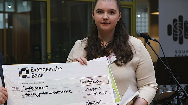 Den zweiten Platz belegte Kaya Fohmann mit ihrem Engagement für junge Straffällige in Leonberg. Nicht zuletzt durch ihr Studium mit dem Schwerpunkt Rechtspsychologie beschäftigt sie sich mit der Frage nach gelingenden Konzepten zur Resozialisierung. Über ihr Ehrenamt zur Unterstützung von Kriminalitätsopfern lernte sie die diakonische Einrichtung ‚Seehaus‘ kennen und war vom dortigen Ansatz so beeindruckt, dass sie seitdem einmal wöchentlich eine Koch- und Back-AG für junge Straffällige anbietet. Dabei geht es ihr nicht nur darum, Spaß am Kochen und Backen zu vermitteln, sondern auch darum, für die jungen Männer Ansprechpartnerin zu sein, wenn sie jemanden zum Reden brauchen. „Das Seehaus Leonberg ist ein Beispiel dafür, was passiert, wenn man jungen Straftätern eine Perspektive bietet und ihnen mit Vertrauen und Respekt gegenüber tritt“, so die Preisträgerin.