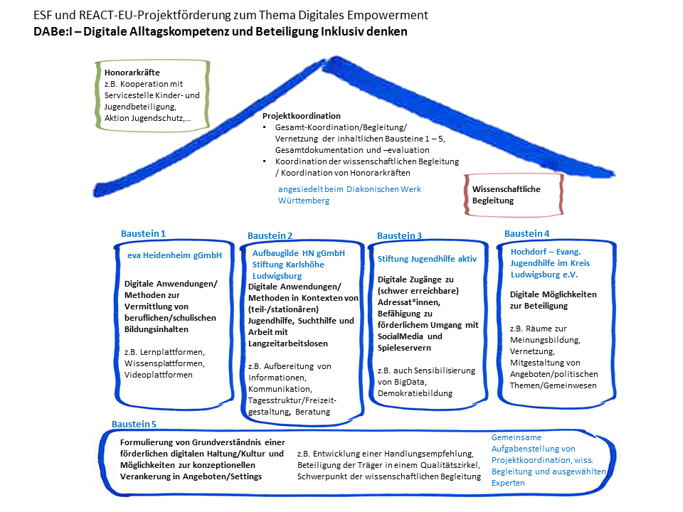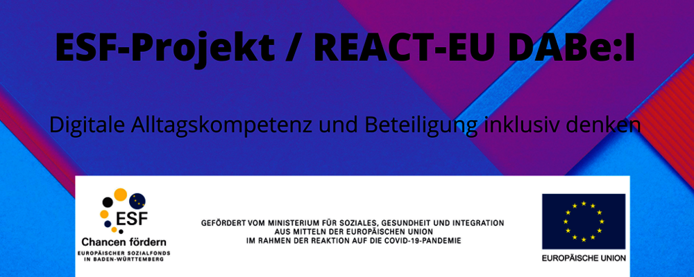 Gefördert wurde DABe:I durch den Europäischen Sozialfonds im Rahmen der REACT-EU Initiative. Der Förderschwerpunkt des Projektes lag in der Digitalisierung Sozialer Arbeit mit dem Hauptziel, Fachkräfte zu qualifizieren und dadurch das digitale Empowerment unserer Adressatinnen und Adressaten zu ermöglichen. Zur Projektbeschreibung.