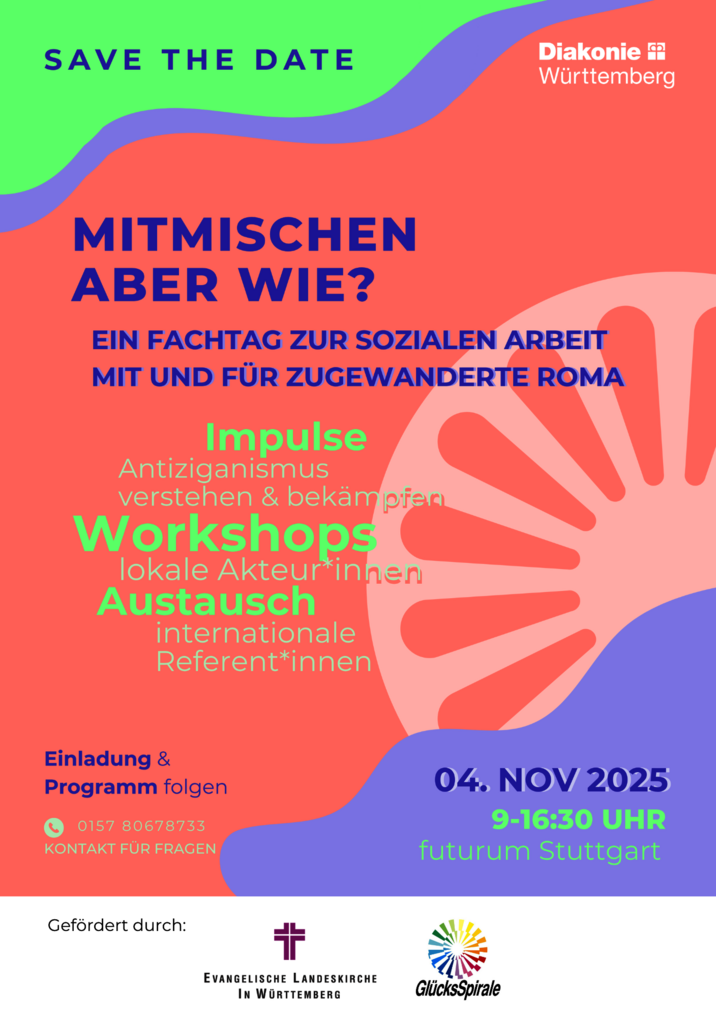 Der Fachtag findet am Dienstag, 04.11.2025 (09:00–16:30 Uhr) im futurum der Diakonie Württemberg in Stuttgart statt und rückt die Ausgrenzung von Roma sowie deren Recht auf Teilhabe als Querschnittsthema Sozialer Arbeit in den Fokus.