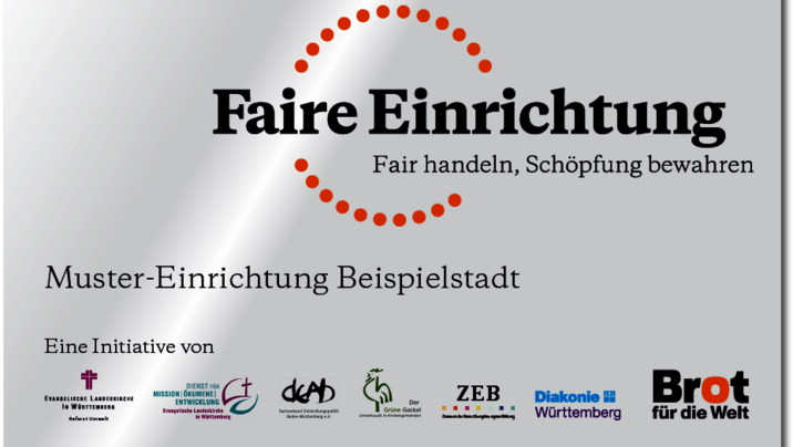 „Faire Einrichtung“ ist eine ökumenische Initiative von: Landesstelle Brot für die Welt im Diakonischen Werk Württemberg, Diözese Rottenburg-Stuttgart, Dachverband Entwicklungspolitik Baden-Württemberg e.V., Dienst für Mission, Ökumene und Entwicklung der Evangelischen Landeskirche in Württemberg, Referat Umwelt im Evangelischen Oberkirchenrat Stuttgart / Geschäftsstelle Grüner Gockel und Zentrum für Entwicklungsbezogene Bildung.